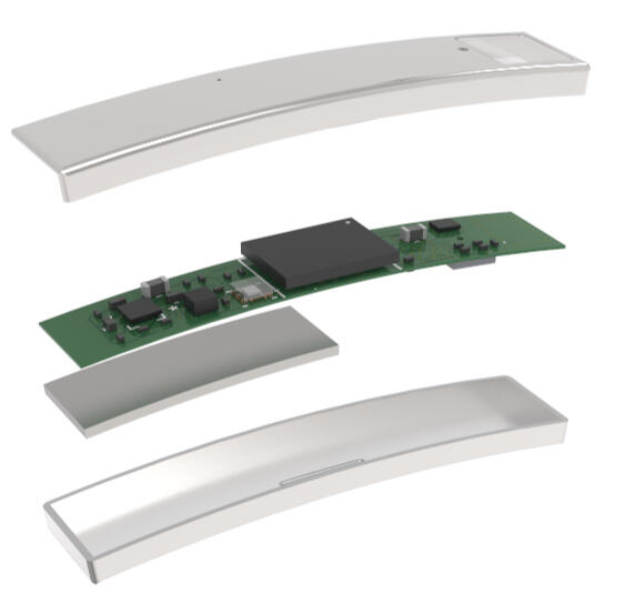 Every component is designed for a baby's wrist — flexible PCB thinner than a credit card, a curved micro-battery, and four precision sensors packed into less than 7mm of width. Accelerometer for movement. MEMS microphone for language. Ambient light and skin temperature for environment.